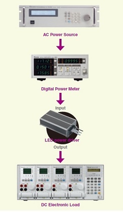 Chroma在电源测试领域已经拥有超过三十年的专业经验,能够提供LED驱动电源的完整测试解决方案。测试仪器主要包括输入端的可编程交流源或者直流源(Chroma 61500系列和Chroma61600系列),精准的数字功率表(Chroma 66202)以及LED专用电子负载(Chroma 63110A,63113A,63115A)。