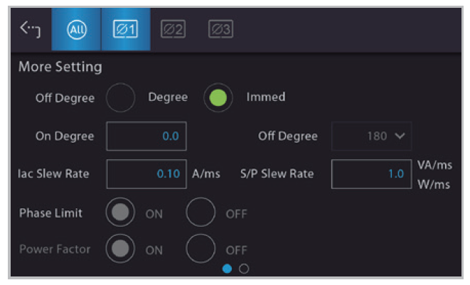 63800R系列能源回收式交流电子负载配备触控式操作萤幕,提供直观的UI介面让用户快速进行多项设定和操作。交流负载的进阶功能如拉载/卸载角度、拉载电流Slew Rate等设定,皆隐藏于右上角More Setting功能,使主设定画面简洁干净。而透过全屏模式,可将所有量测值扩展至全屏,适用于完成输入设定后的观察环节,提供用户更清楚的量测参数画面。
