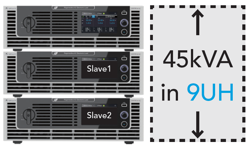 Chroma 63800R系列能源回收式交流电子负载具备主从机(Master-Slave)并联功能,能以总并联台数最多三台来满足更高的拉载功率需求。用户可藉由连接三台同功率63800R系列产品,以一台主机加二台从机的并联架构,实现9U硬体高度内含总拉载功率45kVA的高功率密度配置。